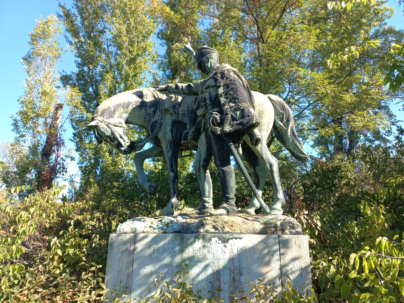 The unusual sculptural work was erected by the officer corps of hussars in honour of their deceased lieutenant general, the one-time cavalry officer, chief inspector and commander of the national defence cavalry. The sculpture depicts a saddled stallion at rest, head lowered, its right foreleg pawing the ground. Standing alongside is a grieving hussar, calming the animal with his right hand on the horse’s neck, holding the reins, with his left hand gripping the hilt of his sabre. The soldier mourns his commander, the horse his master.