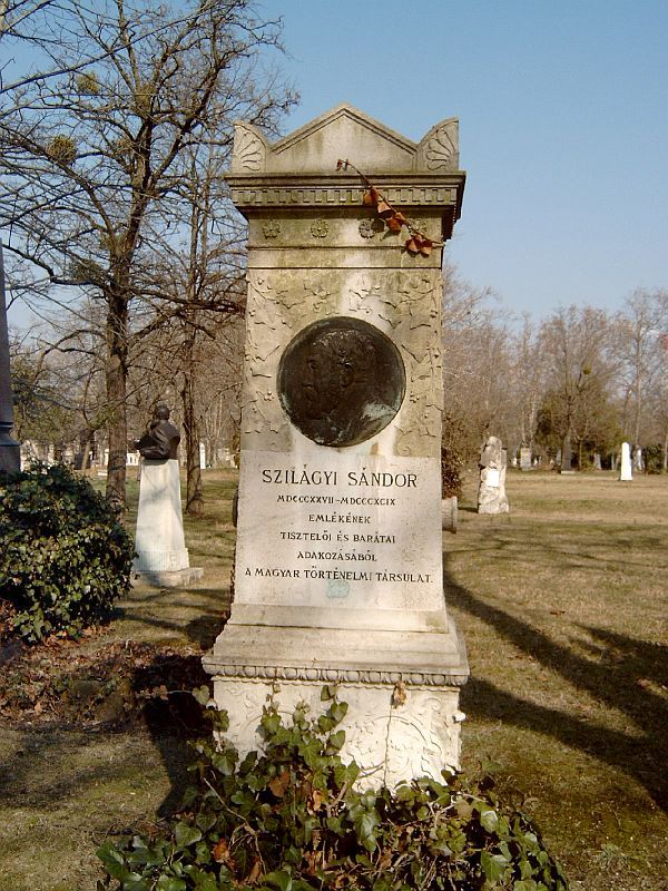 A neves történetíró, Szilágyi Sándor síremlékén a tudóst ábrázoló bronzrelief emlékeztet az elhunytra. Fadrusz ezt a domborművet egy olyan emlékérem alapján mintázta, amelyet Szilágyi Sándor 70. születésnapjára verettek (1897) tisztelői. A jubileumi érmet Scharff Antal, a híres bécsi udvari éremvéső mintázta és a körmöcbányai pénzverő hivatal verte ki. Előlapján Szilágyi Sándor mellképe volt látható, ALEXANDER SZILÁGYI AET. LXX. (Szilágyi Sándor 70 éves korában) körirattal, a hátlap domborműve pedig egy tudóst ábrázolt tanítványai körében, valamint az egyetemi könyvtár épületét, amelynek Szilágyi Sándor az igazgatója volt. A díszes éremből csupán egyetlenegy arany példányt vertek, amit egy ezüst- és egy bronzéremmel bőrtokba helyezve adtak át. Az emlékérem előlapi ábrázolása alapján készült el a síremlék portréképe. A domborművet kiemelik a síremlék dúsan faragott, az öröklétet szimbolizáló borostyánlevél-díszítményei, amelyek mintegy háttérként szolgálnak a portréhoz. A sírkő kompozíciója több hasonlóságot is mutat az építészpáros által korábban tervezett, Semmelweis Ignác számára készített neoreneszánsz stílust idéző síremlékkel: az akrotérion díszítmények, a növényi inda- és levélfaragványok, a díszítő minták variációi mindkét sírnak díszítő elemei. A síremléket 1901 májusában avatták fel ünnepélyes keretek közt.