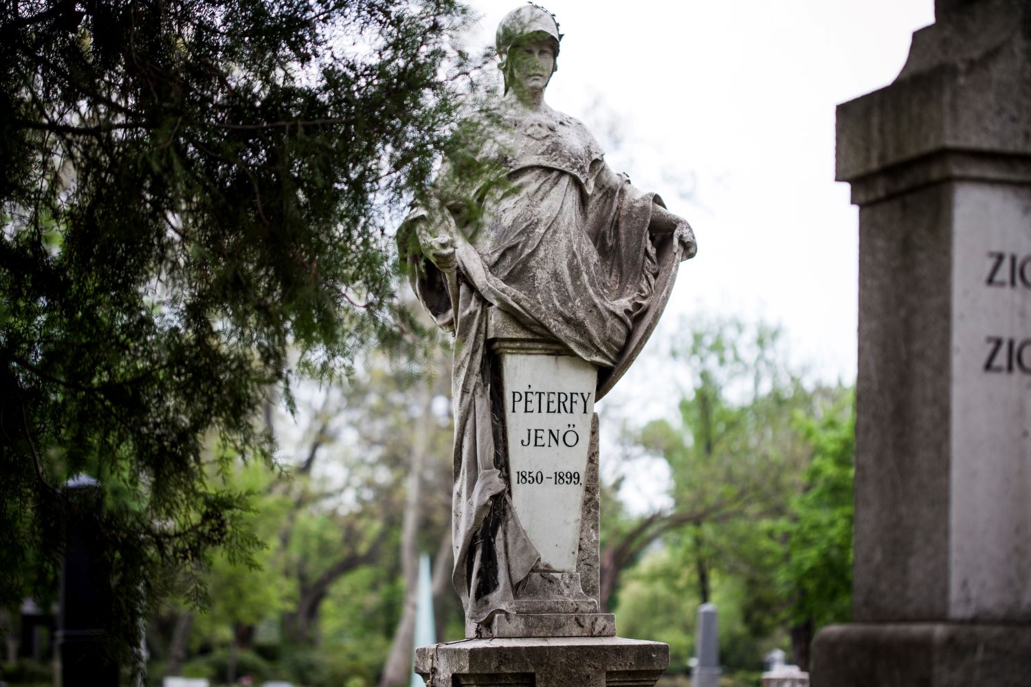 In 1901, Gyula Donáth worked on several tombs in parallel. One was for the mayor of Budapest Károly Kamermayer, another for the teacher and art historian Jenő Péterfy. The two tombs were inaugurated just a few days apart. In the final decade of the life of Jenő Péterfy, he immersed himself in the study of the Greek language and history of Greek literature. His tomb depicts his last great love, one of the iconic figures of Greek mythology, Pallas Athena. The goddess has a helmet on her head, a breastplate, a torch in her right hand and in her left a shield bearing a portrait of Péterfy.