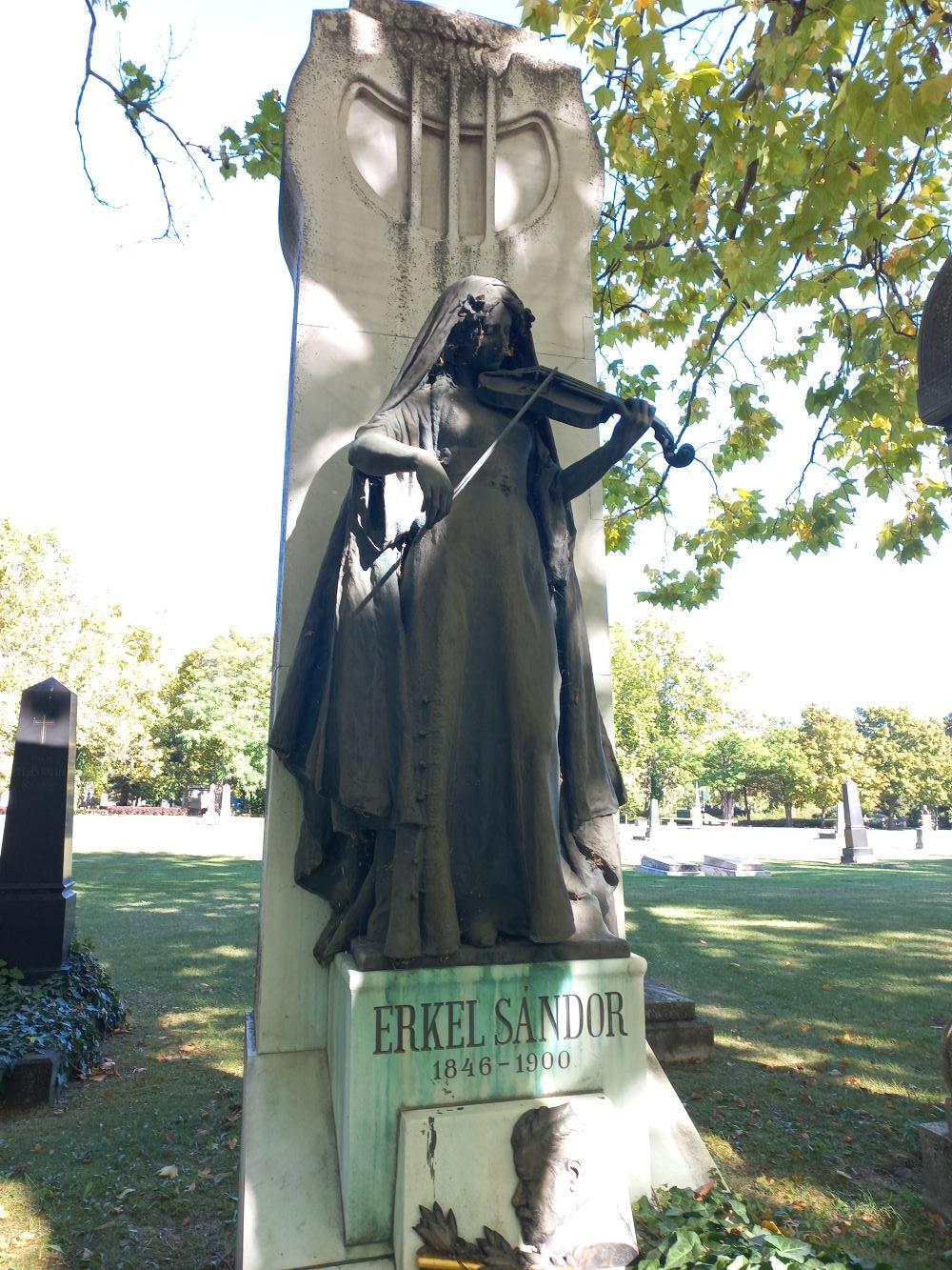 Erkel Ferenc és fia, Sándor nyughelyének méltó emlékkel való megjelölését maga a miniszterelnök, Széll Kálmán kezdeményezte 1903 legelején az Operaház vezetőségénél. Mindkét síremlék építészeti elemeinek tervezésére a magyarországi szecesszió egyik jelentős építészét, Márkus Gézát kérték fel. Erkel Sándor síremlékének egyedi formája és díszítése különleges példája a temető szecessziós síremlékművészetének. A sírt egy stilizált húros hangszer, az ókori görögök által használt líra formájában végződő márványobeliszk jelöli, amelynek két oldalát alul az énekéről híres, Apollónak szentelt madarat, a hattyút ábrázoló dombormű díszíti. A síremlékre a magyar zene allegóriájának szobra került, egy magyaros gyászruhába burkolt, hegedűn játszó nő, aki örök muzsikájával emlékeztet az elhunyt halhatatlanságára. A bronz főalak arcvonásaiban Róna József szobrászművész a felesége unokahúgát, a legendásan szép és sokoldalú Vészi Margitot örökítette meg. Az emlék talapzatán az egykori főzeneigazgató, Erkel Sándor arcképének domborműve látható, rajta a karmesteri jelvényekkel, partitúrával és a vezénylő pálcával.