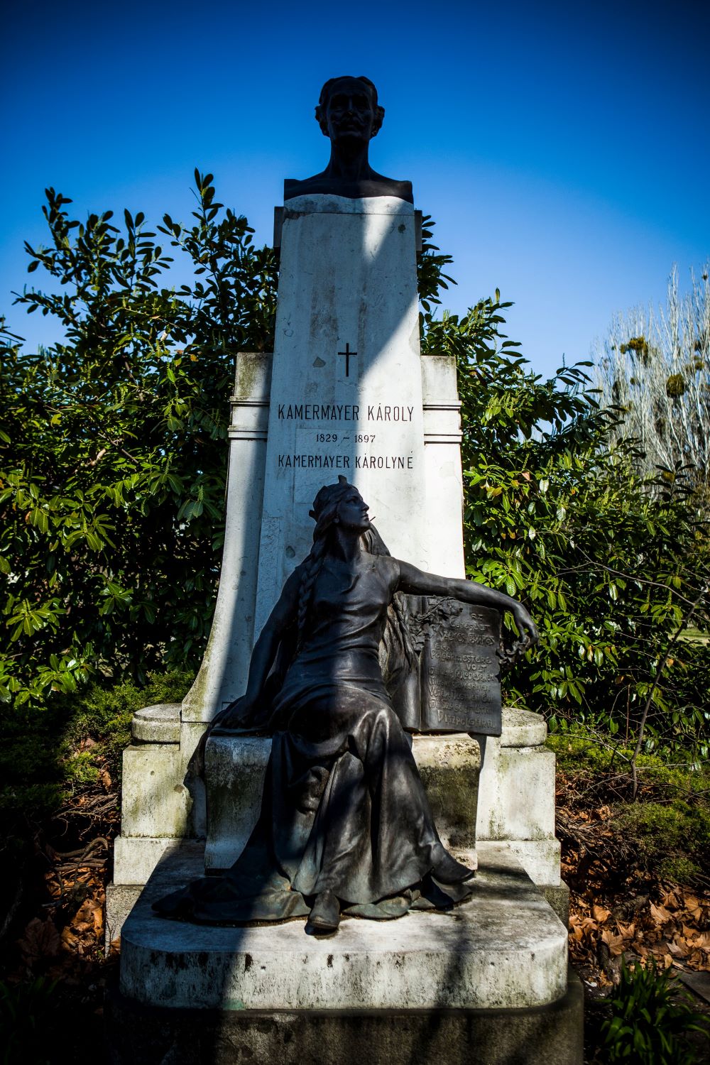 The tomb pedestal and column supporting the bust are of marble while the bust of Kamermayer and the figure of Clio are cast in bronze. The stone carving was carried out by Béla Senger, an artist much in demand at the time.