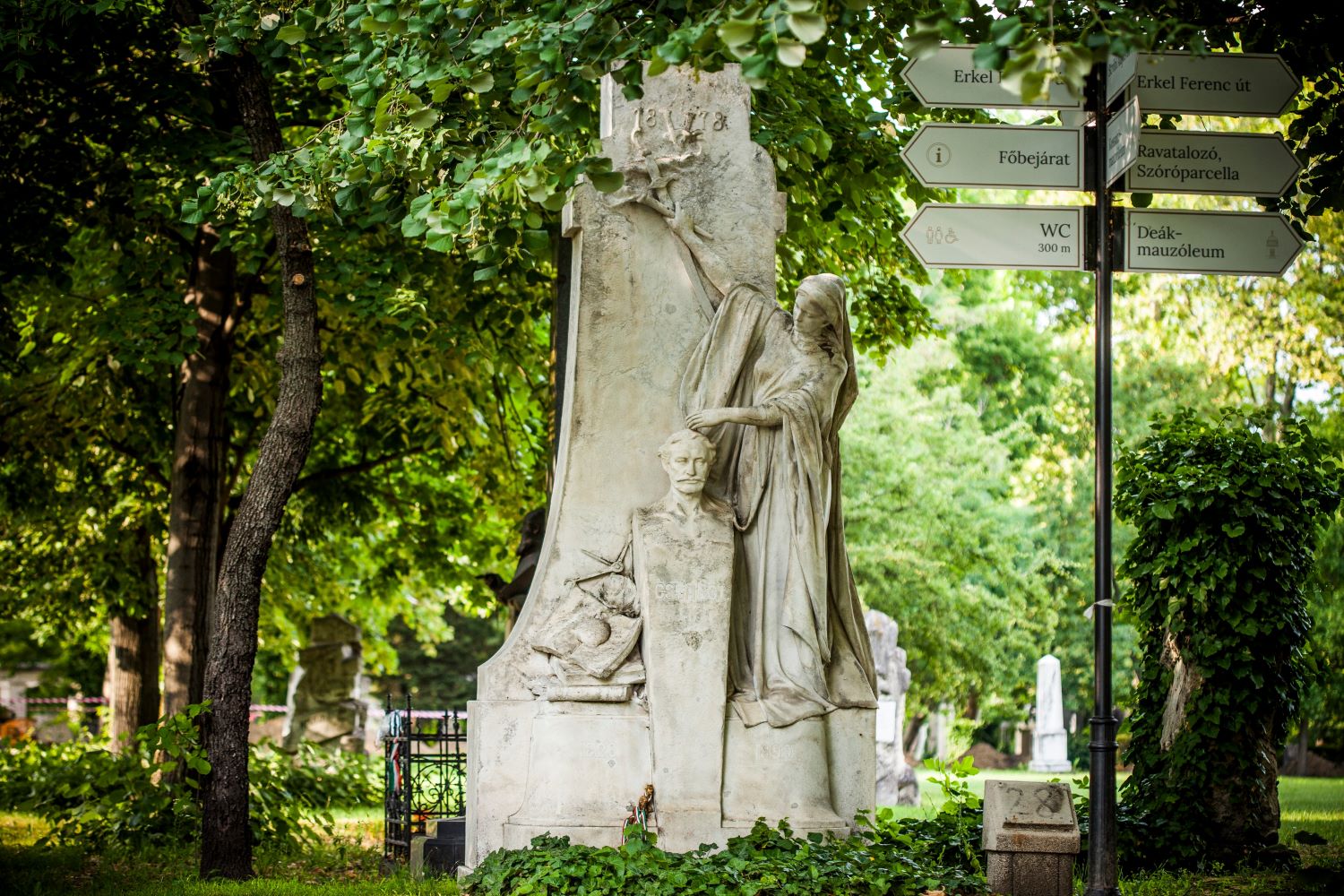 The principal figure on the tomb of Károly Csemegi is Justitia, goddess of justice, who with her left hand touches the brow of Csemegi while in her right she bears a sword and flaming torch illuminating an inscription in the upper part of the sculpture.
