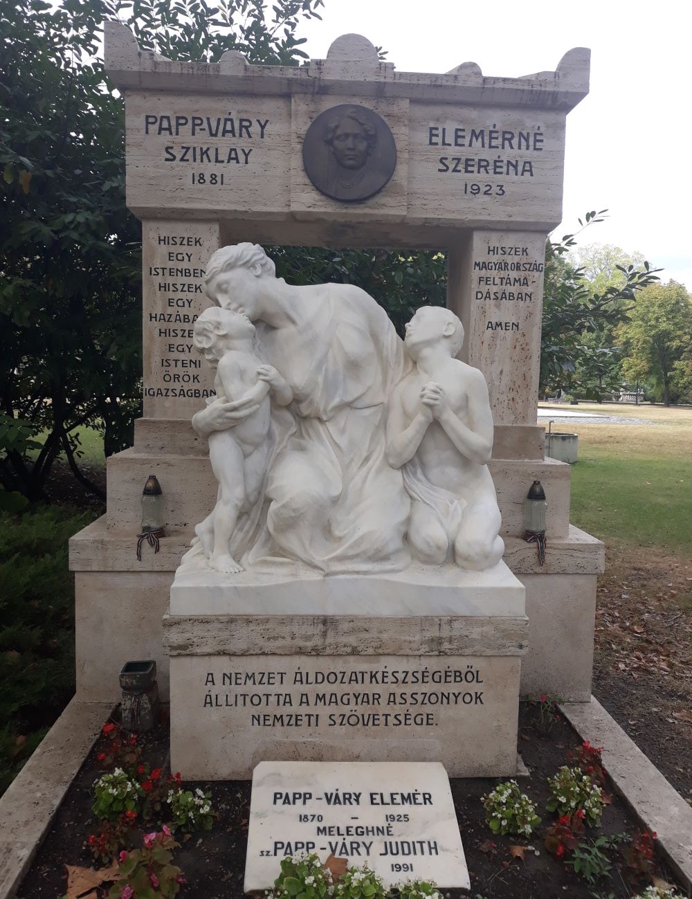 The lines of this supplication were inscribed on the tomb of the poetess, on the columns supporting the sarcophagus. The composition comprising three figures shows a kneeling mother between her two children. Bending over one of the children, she is whispering the Hungarian Creed, which the two children are repeating after the mother with hands clasped in prayer. The composition is framed by a sarcophagus located on columns, on which there is the portrait in relief of the poetess.