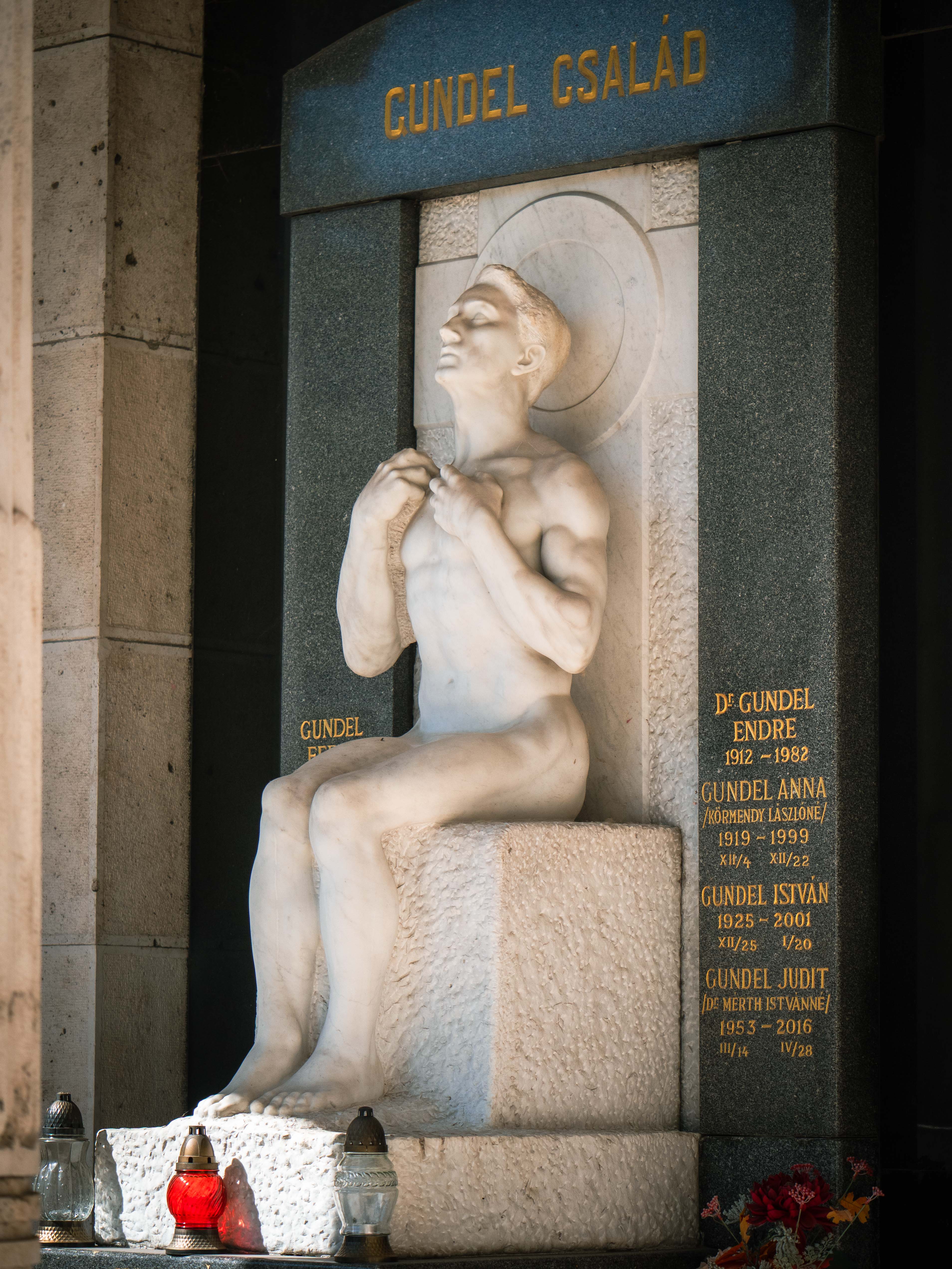 A síremlékszobor a tragikusan elhunyt fiatal festőművész, Göröncsér-Gundel István emlékét hirdeti. A kereszt előtt ülő fiatal férfi akt lehunyt szemét az ég felé emeli, kezét mellkasára helyezi. Szokatlanul egyenes testtartása, felemelt feje magabiztosságot és elszántságot sugároz, míg az ég felé forduló lezárt szemhéjak az ismeretlen, földön túli világ felé fordulást, az élet végébe való belenyugvást fejez ki. Az ifjú művész halálának híre bejárta a korabeli sajtót, a család által megakadályozott házasság miatt mennyasszonyával együtt a halálba menekültek. A fiatalember először kedvesét, majd magát lőtte meg. Ő azonnal meghalt, míg menyasszonyát, Ilonát sikerült megmenteni, de a fiatal lány később saját maga vetett véget életének. Testét ugyanebbe a családi kriptába temették el.