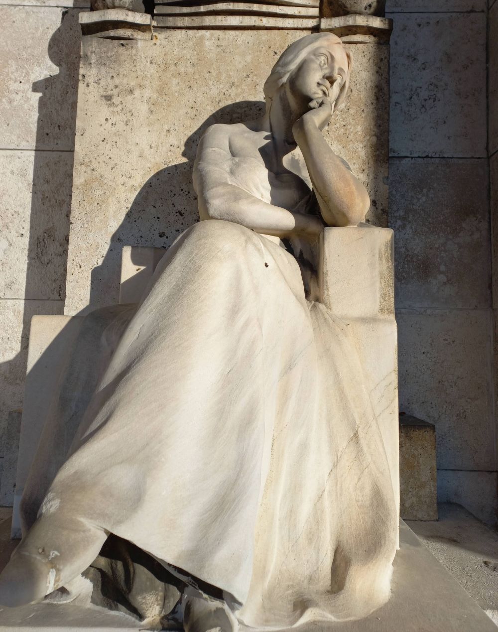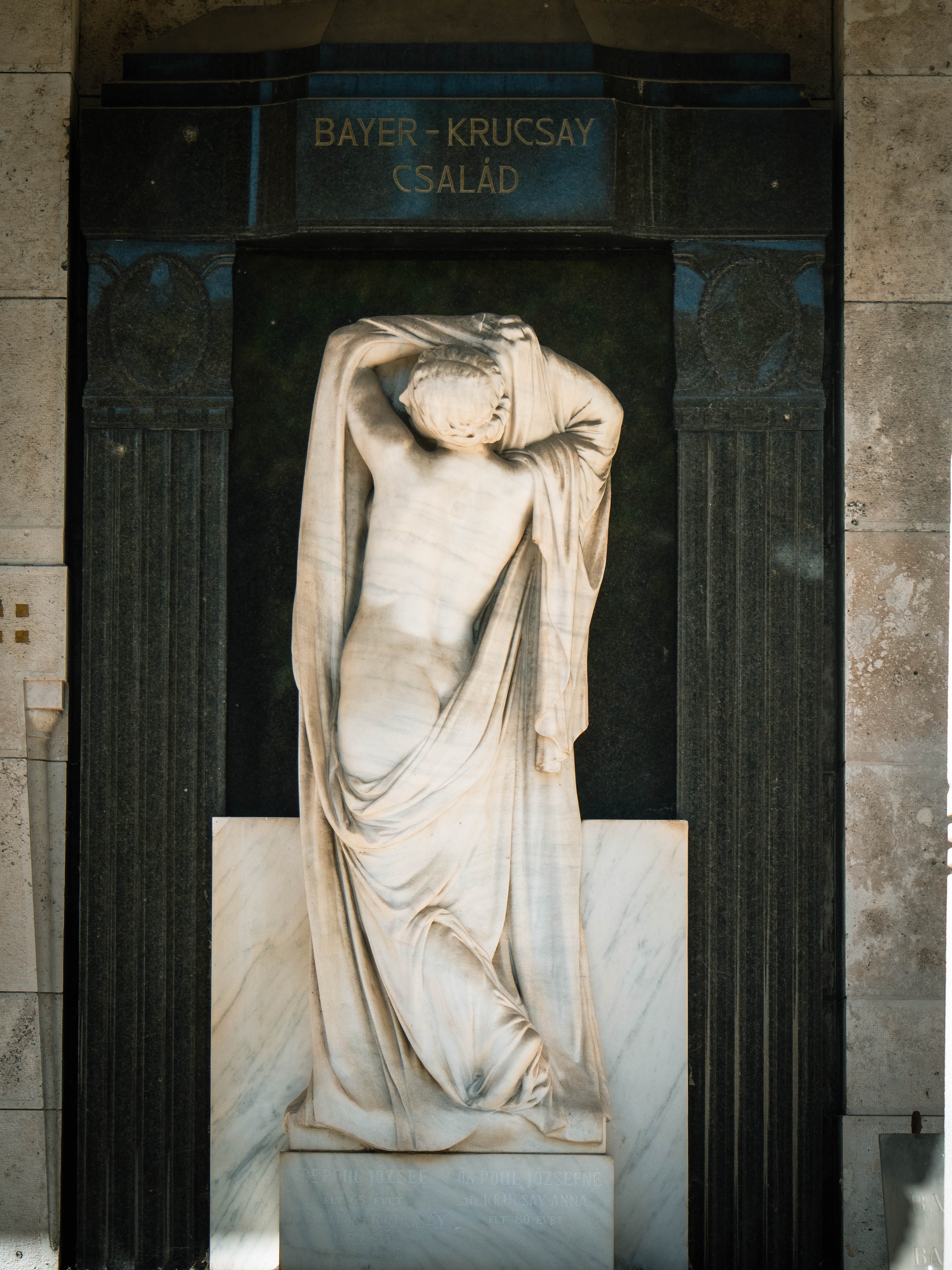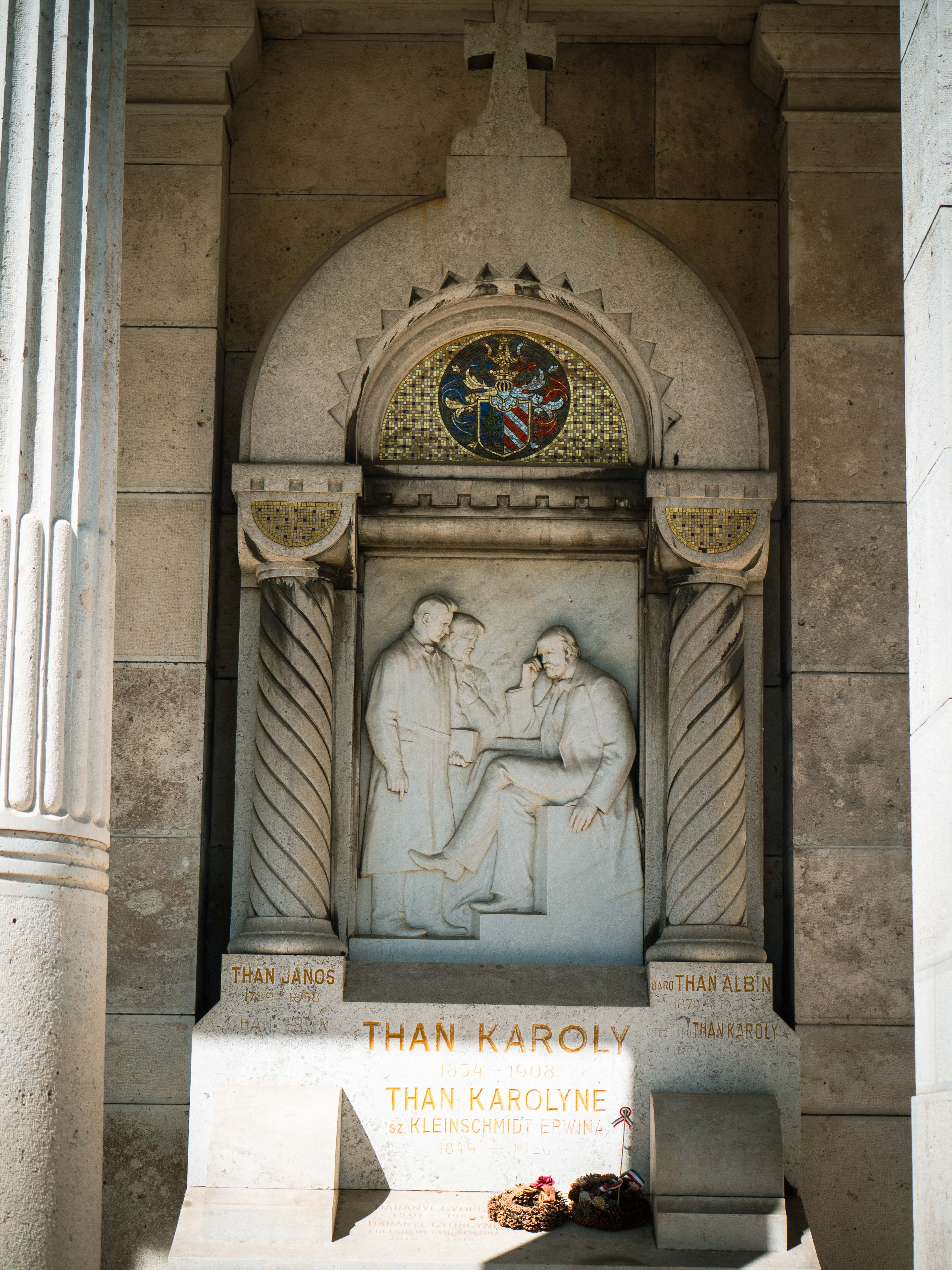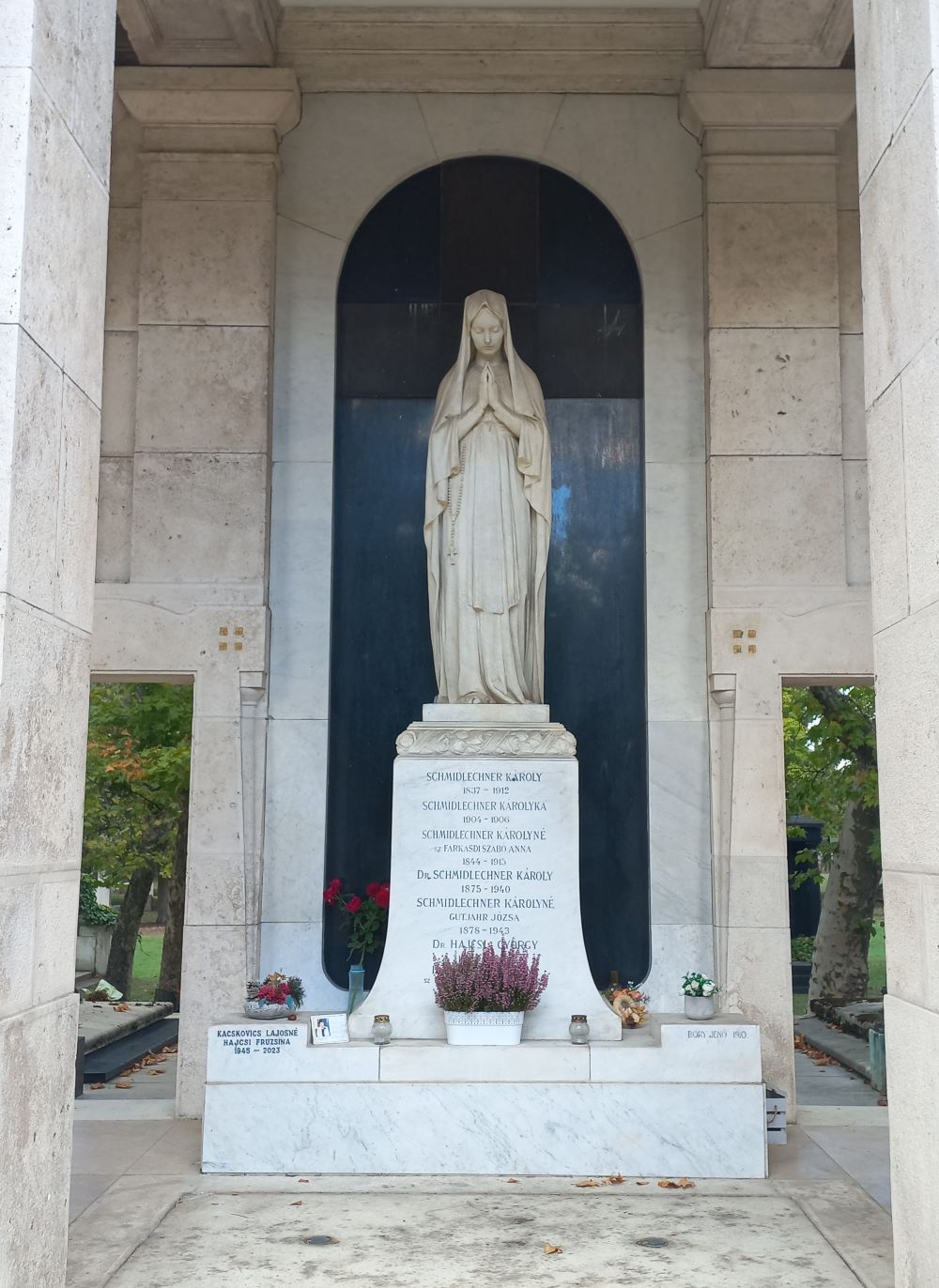 The sculptor was inspired to make this tomb having seen the statue of Our Lady in the Lourdes rock cave, one of the most famous places of pilgrimage to the Virgin Mary. The work by Jenő Bory shows the figure of Mary, hands together, eyes closed, head bent in prayer, whereas the Lourdes work depicts Our Lady with eyes looking towards heaven, begging for atonement and forgiveness. The black background to the white marble statue in an arched niche standing on a pedestal creates a powerful contrast, thus highlighting the contours of the statue, but at the same time reminding the viewer of the cave shrine in France.