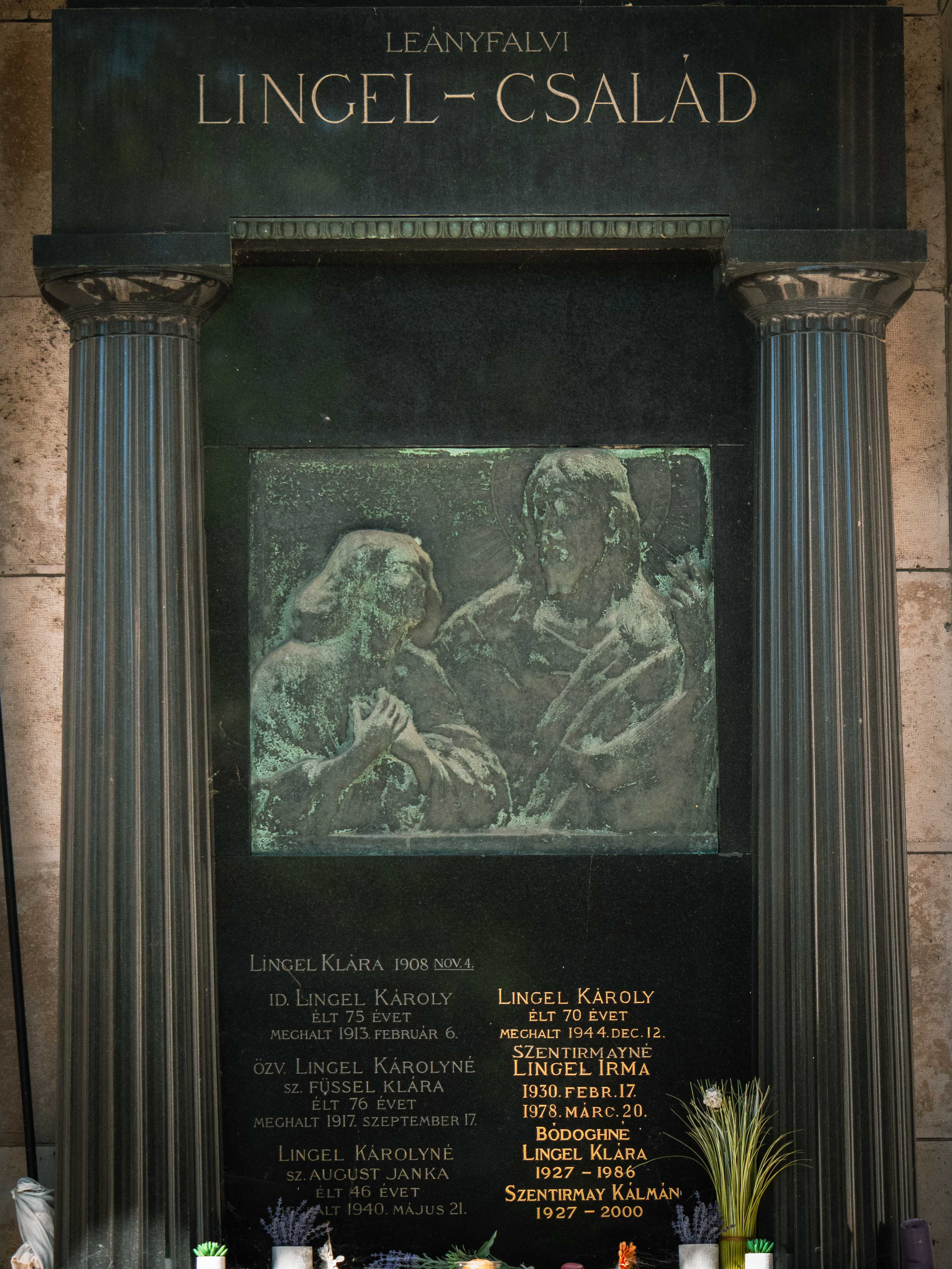 A síremlék Lingel Klára, a bútorgyáralapító lánya halála után készült, akit elsőként temettek el az épp befejezés előtt álló árkádsorban megvásárolt családi kriptában. Az oszlopokkal keretelt fekete gránit síremlék monumentalitást sugároz. A középen elhelyezett dombormű szakrális jelenetet ábrázol, Mária Magdolna találkozását a feltámadt Jézussal. A Jézus sírjánál egyedül virrasztó Mária elsőként találkozik a feltámadt Krisztussal, aki nevén nevezi őt és fontos megbízatást ad számára: vigye hírét feltámadásának. A dombormű jelenete az örökélet reményét hirdeti, a kriptában nyugvók lelki békéjét és a feltámadásba vetett hit erejét jelképezi.
