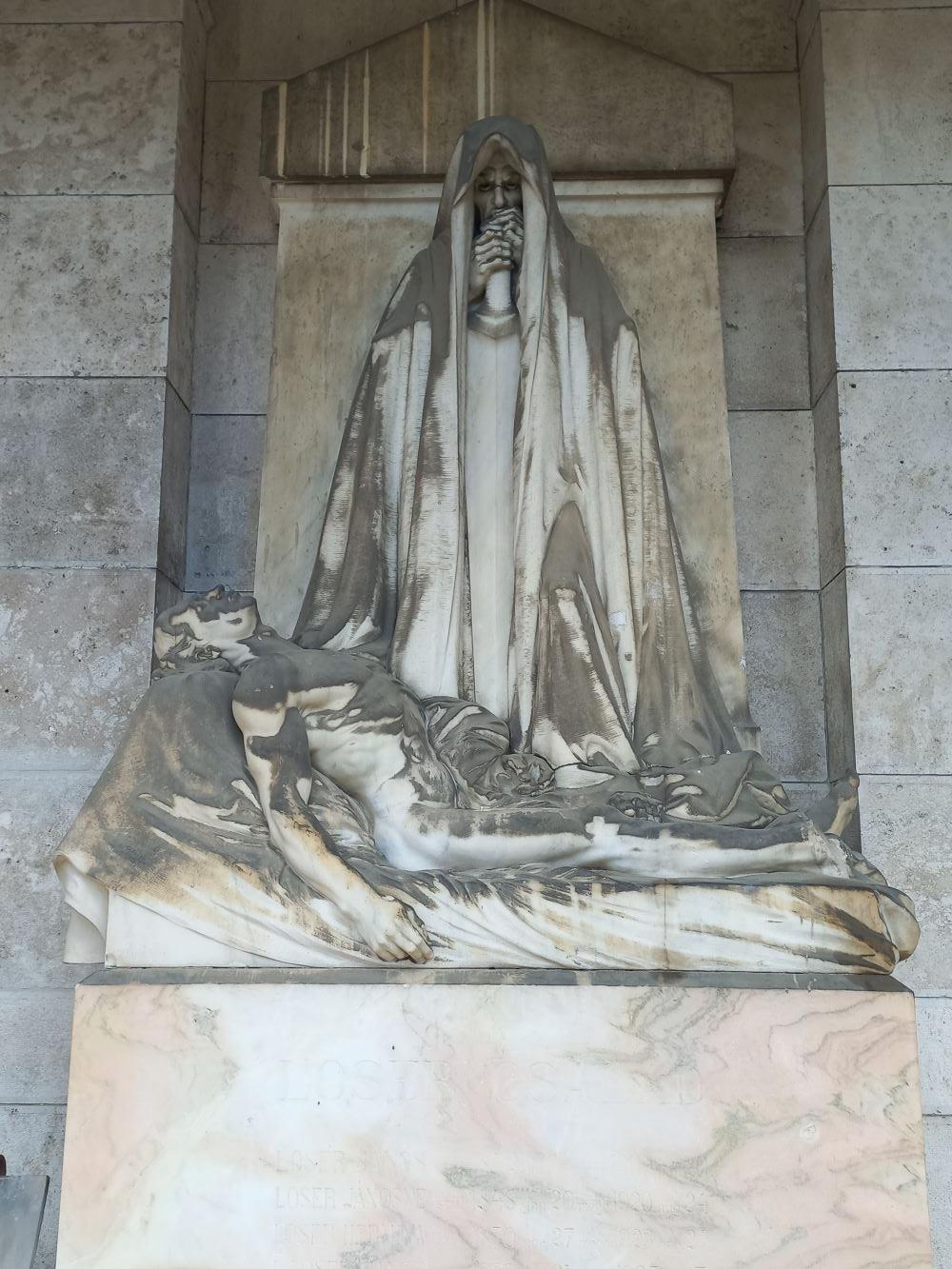 A sírkert egyik legmeghökkentőbb sírszobra a Loser család sírhelyén áll, a bal oldali árkádok alatt. Az ásványvíz-nagykereskedő és -forrástulajdonos, Loser János nyughelyét jelölő emlékmű készítésének pontos idejét nem tudjuk, de 1914-ben már meglévő síremlékként említik. A két alakból álló kompozíció egyike egy csuklyát mélyen arcába húzó agg férfi, aki szigorú, kemény tekintettel mered maga elé. Kezében maga előtt pallost tart, bal lábával pedig az előtte heverő fiatal férfi testére tapos. Mozdulata könyörtelen és visszavonhatatlan. Alakja, megformálása a halált jeleníti meg, míg az előtte heverő élettelen test az emberi lét elmúlását fejezi ki. Az ifjú mezítelensége a kiszolgáltatottságot, fiatalsága a könyörtelen végzetet jelenti. A halál képében megjelenített öregember és a ravatalon fekvő emberiséget jelképező fiatal fiú kontrasztja még inkább felerősíti a szobor érzelmekre gyakorolt hatását. A mű készülésekor a nagy háború veszélye intuícióként működhetett a szobrászművészben, a fiatal férfi teste a harctereken elhunyt sok ezer elesett katonát is megidézi.
