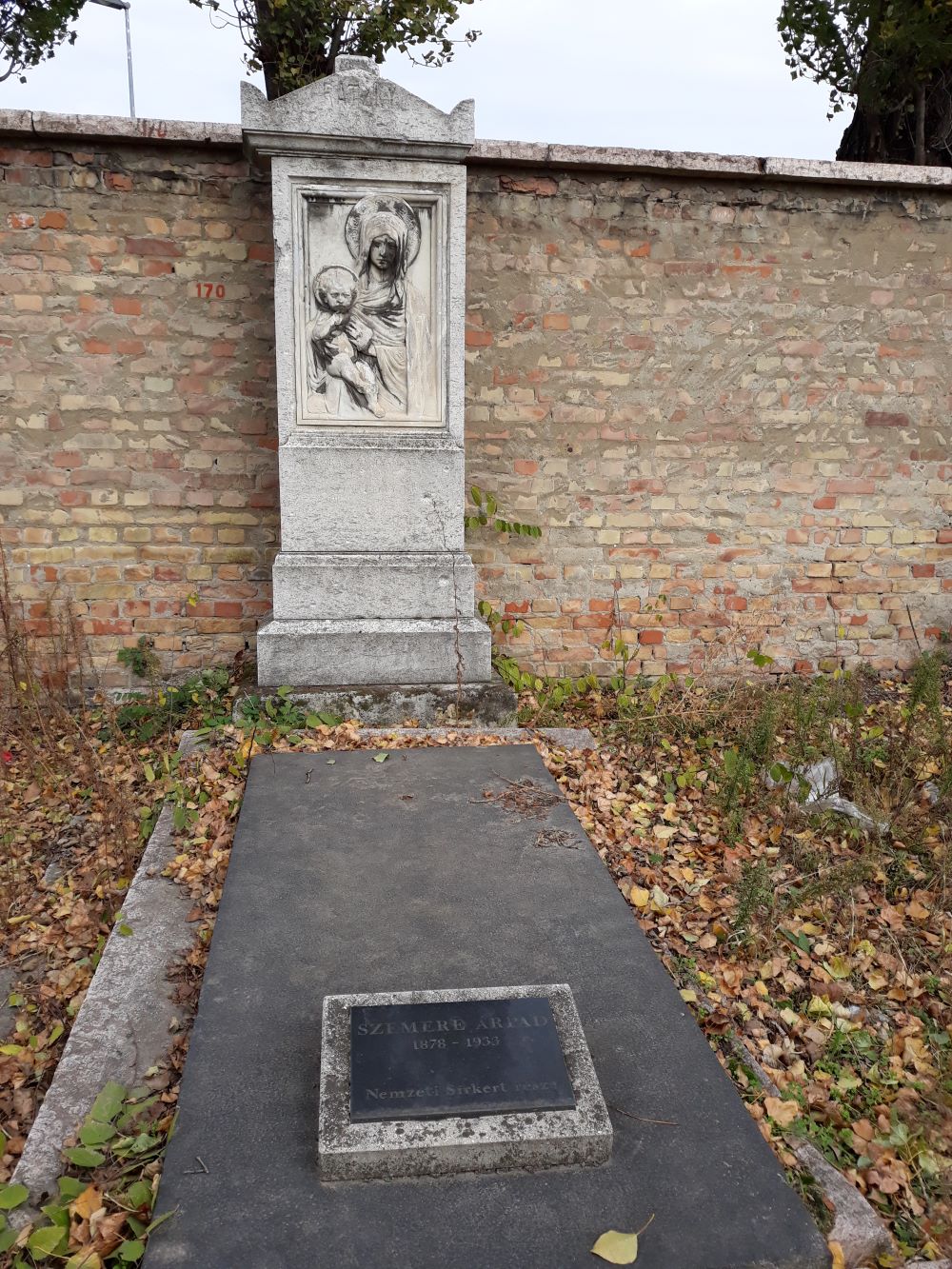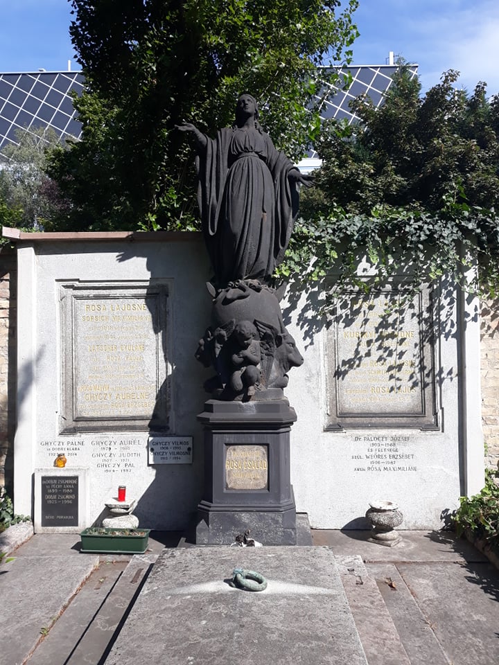 The funerary statue in the Rósa family wall tomb is a replica of the Maria Immaculata in Rome. The original was made by Guiseppe Obici (1807–1878) in 1858. From the very earliest times, the Roman Catholic church had believed that Mary conceived in an immaculate state, preserved from all original sin. However, this doctrine only became dogma in a bull proclaimed by Pope Pius IX on 8 December 1854. The Italian sculptor made his Maria Immaculata statue as a mark of respect and it quickly became one of the iconic works of art in Rome. The Mother of God located at the top of a Corinthian column stands on a globe with crescent moon, crushing a serpent, symbol of sin, beneath her feet. The globe is ringed by the symbols of the four Evangelists, the angel for St. Matthew, the ox for St. Luke, the lion for St. Mark and the eagle for St. John. The crypt of the Rósa family was inaugurated as a tomb in the early 1900s.