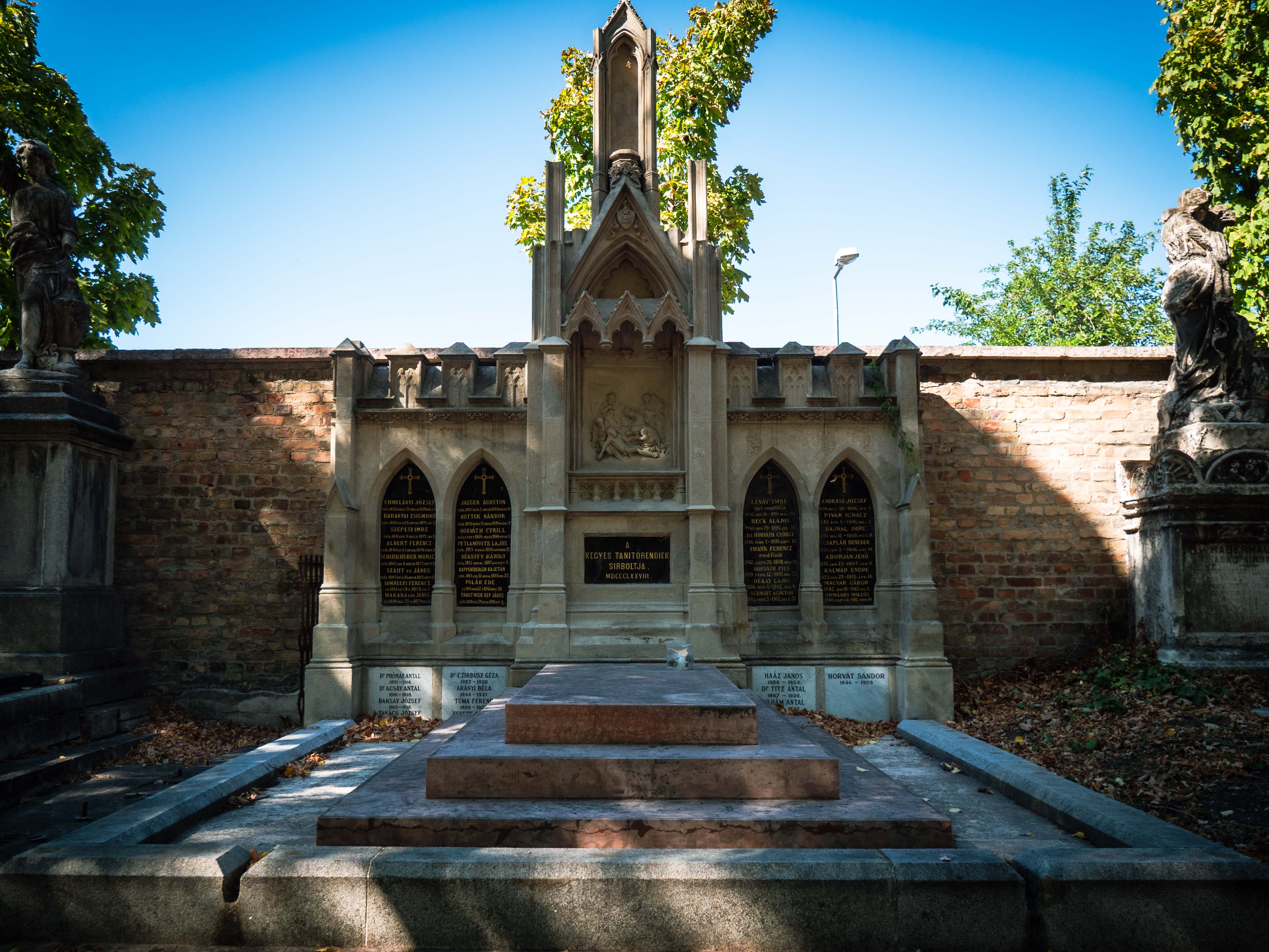 A kegyes tanítórend régi sírboltja a temető baloldali falsírboltjainak egyikében létesült, számos neves piarista tudós és tanár nyughelye. A különleges szépségű, reprezentatív síremléket Gottgeb Antal építőmester emelte 1878-ban, neogótikus stílusban. A középkori szárnyas oltárokat idéző építmény tornyai közötti oromzati fülkében eredetileg Szűz Mária szobra állt, amely sajnos mára már elveszett. Az alatta található fülkében Krisztus sírbatételének domborműve látható. A homlokzat középső csúcsívébe a piarista rend Mária-monogramos címere került: a címerpajzsban Szűz Mária monogramját alkotó, egymásba fonódó M és A betűk, kereszttel ékesített korona, és a görög MP ΘY betűk, a Métér Theou (Isten Anyja) szavak nagybetűs rövidítése látható. Az építmény kétoldali „szárnyának” fülkéiben az elhunytak neve olvasható.