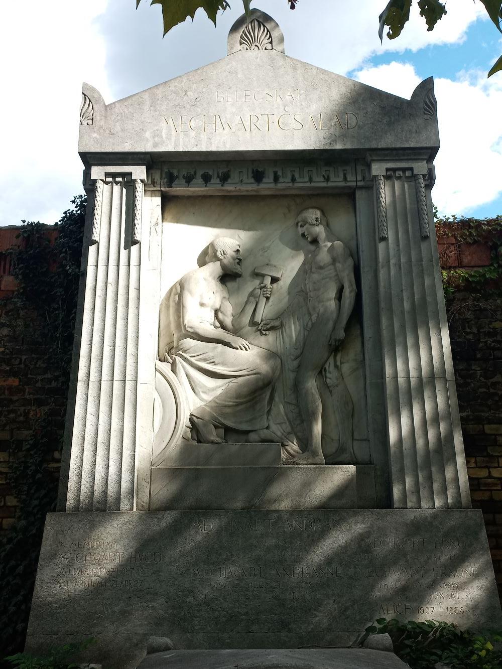 A síremlék tervezőinek, Alpár Ignácnak és Telcs Edének élete több ponton is összekapcsolódott, nemcsak barátok voltak, hanem közös munkában alkotótársak is. Mechwart András síremléke is kettőjük közös alkotásaként valósult meg. A síremlék az ókori aediculum, vagyis egy, oszlopokkal körülfogott timpanonnal lezárt fülke formáját idézi, amiben a plasztika helyezkedik el. Mechwart András síremlékén két kannelúrázott pilaszter között látható a dombormű, amelynek témája szintén antik mitológiai ihletésű. Idős, lepelbe burkolt férfialak a kezében kalapácsot tart, amelyet épp átnyújtani készül az előtte álló fiatalembernek. Az idős alak Héphaisztoszt, a tűz, a kovácsmesterség görög istenét, a fémművesek védelmezőjét jeleníti meg, akinek műhelyében készültek az istenek és a hősök tárgyai: Zeusz villámai, Erósz nyilai, Prométheusz bilincsei és Zeusz rettegett pajzsa, amelynek részlete a domborművön is látható. Az antik művészetben szakállas emberként ábrázolták, kalapáccsal a kezében, csakúgy, mint a Mechwart-síremléken. Héphaisztosz alakjának felidézése utalás a lakatosinasból mérnökké lett Mechwart András elévülhetetlen érdemeire: ő tette világszínvonalúvá a hazai gép- és villamos gépipart. A dombormű idős alakja tehát szakállt visel, ülő pozícióban van, mint aki a hosszú kemény munkával töltött években elfáradt, s a „stafétabotot”, vagyis a munkát, a tudást, a tapasztalatot – amit a kalapács szimbolizál – átadni készül a fiatal generációt képviselő ifjúnak. Az idős Mechwartot szimbolizáló Hephaisztosz alakja, bár kissé görnyedt, ugyanakkor izmos teste még mindig a tettrekészséget fejezi ki.