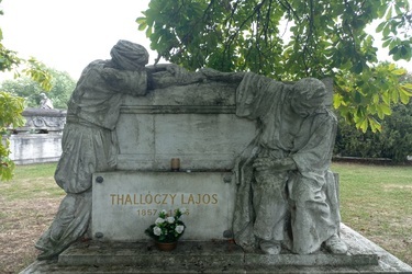 Thallóczy Lajos (1857–1916) a dél-szláv népek történetének első hazai kutatójaként jelentős szerepet töltött be az Osztrák-Magyar Monarchia balkáni politikájában.1901-től az Osztrák-Magyar Monarchia ellenőrzése alá vont Bosznia-Hercegovina oktatási, művelődési és kultuszügyeinek felelőse lett, 1915-ben az I. világháború során megszállt Szerbia polgári kormányzója. Halálát a herceghalmi vasúti szerencsétlenség okozta, Ferenc József temetéséről Pestre jövet. Síremléke a hazai balkán kutatás megteremtőjének és a térség politikusának állít emléket a szarkofág mellett álló, két féle népi viseletbe öltözött férfi alakjával. A jobb oldali ülő figura egy maga elé meredten tekintő magyar paraszt, a másik egy, arcával a koporsóra boruló bosnyák. Megtört alakjuk a közös fájdalmat és a gyászt fejezi ki, a kőláda tetején összekulcsolt kezük a közös sorsban való osztozást példázza. A készülő alkotást maga Albrecht főherceg is megtekintette 1918 nyarán a szobrászművész műtermében. A kompozíció gipszmodellje szerepelt a Céhbeliek (Magyar Képzőművészek Köre) művészcsoportjának a Nemzeti Szalonban 1918-ban megrendezett kiállításán, valamint a Műcsarnok 1919-ben megrendezett Téli Tárlatán, ahol „érdekes felfogású” Thallóczy-emlékműnek aposztrofálták. A síremlék 1920-ban került az elhunyt hantja fölé, avatása vélhetően a politikai események tragikus alakulása miatt nem kapott nyilvánosságot.