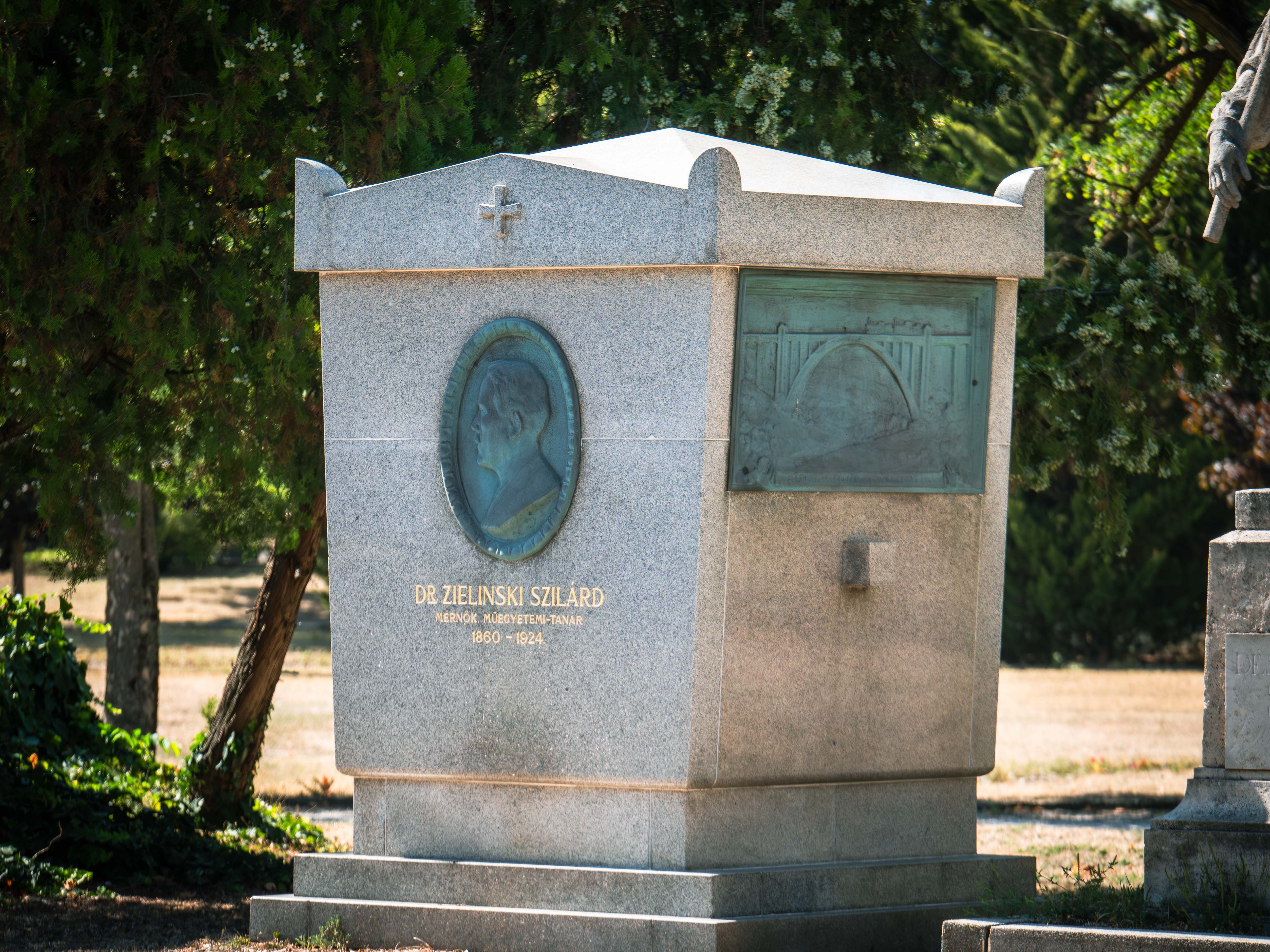 Síremlékének építészeti tervei Walder Gyula, plasztikai díszítése pedig egykori tanítványa, Bory Jenő munkája. Zielinski Szilárd síremléke az egykor élt mérnök életét idézi meg: portréja a tudós emlékét, az alkotásairól készült domborművek pedig az életművét reprezentáló alkotásait. A szürke gránit szarkofág négy oldalán lévő bronzreliefek közül három egy-egy műszaki építményt ábrázol. Egyikén a Brassó-Fogarasi völgyhíd látható, amely az egyik büszkesége volt a tervezőnek, hisz e hidat a legkevesebb anyag felhasználásával, a lehető legkisebb költséggel, legszebb formában, mégis a legnagyobb hordképességgel sikerült megépíteni 1908-ban, amely az akkori világ legnagyobb ívnyílású völgyhídjának számított. A másik dombormű az 1911-re elkészült margitszigeti víztornyot örökíti meg, amely a sziget növekvő és zavartalan vízellátását biztosította, ugyanakkor pedig kilátótoronyként is működött. A harmadik dombormű az 1928-ban átadott Budapesti vámmentes kikötőt ábrázolja, amelynek megtervezését több évtizedes tanulmányok és előmunkálatok előzték meg. A szarkofág főhomlokzatán elhelyezkedő dombormű Zielinski Szilárd balra néző portréját ábrázolja.