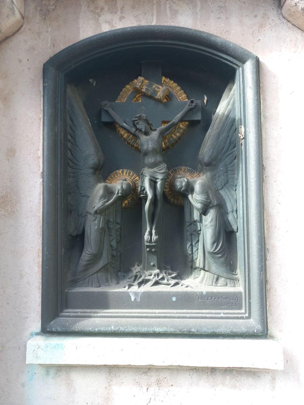 Az 1926-ban készült gránitba foglalt bronz oltárt a szobrászművész kiemelkedő alkotásai között tartják számon. Ennek a műnek másodpéldánya került a szobrászművész apósa, Kern Ferenc sírjára. A keresztre feszített Krisztus két oldalán egy-egy, az arcukat a kezükbe temető, zokogó angyal látható. A szobrász jól ismert kísérletező kedve csillant meg ebben a művében is: Jézus és a szomorúságot árasztó angyalalakok feje fölé fogaskerekekre emlékeztető glóriát mintázott. A köralakzatokat a nimbusz arany színe emeli ki a szürke háttérből, a dicsőséget jelölő fény teljes kontrasztban jelenik meg a domborművön. A dombormű két oldalához simuló angyalok szárnyai keretbe foglalják a golgotai jelenetet. A síremlék építészeti elemeit Jámbor Lajos és Bálint Zoltán tervezete, akikkel a szobrászművész pályafutása során több alkalommal is együttműködött. Az építészpáros tervezte a szobrász legismertebb munkájának, a városligeti Anonymus-szobornak a talapzatát, valamint a Stefánia úton található műteremvilláját is.