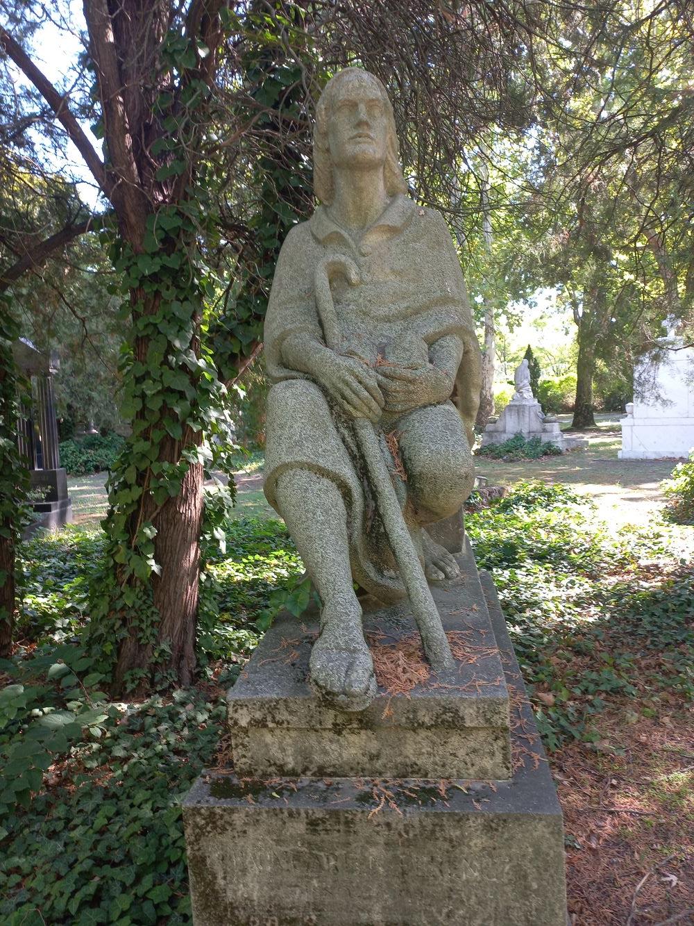 „Da sitzt ein Pilgerim und Wandersmann” (’Itt ül egy zarándok és vándor’) – a magyar irodalom nagy mecénása, Baumgarten Ferenc síremlékén kedves költője, Conrad Ferdinand Meyer egyik versének idézete olvasható, amelyet sokszor vonatkoztatott önmagára is. A síremlék kőpadon ülő, hosszú köpenybe burkolt vándor alakja szintén a Zarándok című verset idézi meg. A férfi egyik kezében vándorbotot, másikban könyvet tart. Jobb lábát előre nyújtja, bal lábát ellentétes mozdulattal húzza maga alá. Fedetlen fejének arckifejezése komoly, tekintete távolba néz, szemével fürkészi a messzeséget. Miként a vándor és a zarándok magányosan jár-kél a világban, otthonra igazából sosem talál, gyökeret igazából sehol sem tud verni, úgy az író, mecénás Baumgarten Ferenc életét is az állandó útkeresés töltötte ki. Ő a „nagyvilág fáradt zarándoka”, ahogy Babits Mihály a sírkő felállításakor nevezte az elhunytat. A megpihenő vándor alakja egyben a végső megpihenés, az örök nyugalomra találás szimbóluma. A Baumgarten-síremlék vándor alakja a szobrászművész Katona Józsefet ábrázoló, befejezetlen szentendrei szobrában köszön vissza. Eredetileg a sírszobor anyaga haraszti mészkő lett volna, de a munka elkezdése után nem sokkal a művész meggondolta magát és Baumgarten síremlékét inkább márványban faragta meg. Másfél évtizeddel később a félbehagyott (mészkő) vándor alakot folytatva kezdte megfaragni Katona József ülő alakját, amit viszont már nem tudott befejezni a szobrászművész, így az alkotás félkész maradt.