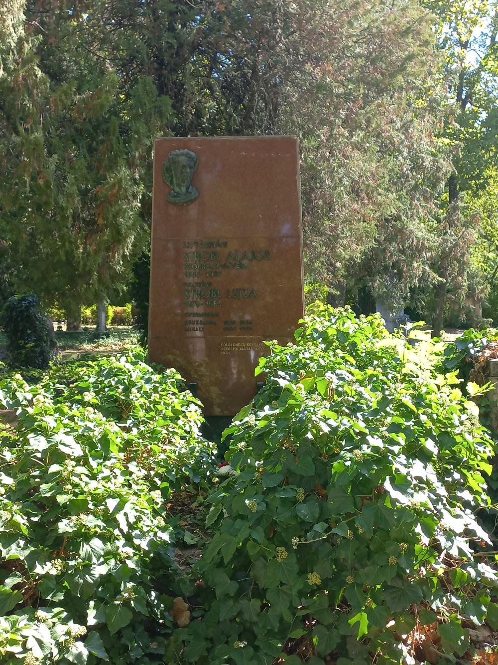A századforduló nagy szobrászmesterének hamvai felett látható második síremlékét halálának 45. évfordulóján, 1971. december 13-án avatták fel. Eredeti síremlékét a művész végakarata alapján, sírhantjára fektetett egyszerű csiszolt gránitlap jelölte, amely még szülőföldjéről, a Liptó megyei Alsóbocáról származott. A gránit a művész egyik kedvenc nyersanyagainak egyike volt, több plasztikájában is alkalmazta, mint például a városligeti Károlyi Sándor szobornál vagy Szilágyi Dezső síremlékénél. A sírt jelölő nagyméretű gránitlap 1945-ben egy aknabecsapódás következtében több darabra törött: két és fél évtizeden át ez a törmelék képezte Stróbl Alajos sírját. Az 1960-as évek végén merült fel ennek a méltatlan állapotnak a felszámolása és egy, a szobrászművészhez méltó, új síremlék felállítása. A síremléktervet Pfannl Egon építész készítette, a kövön lévő, művészt ábrázoló bronz domborművet pedig a Nemzeti Galéria gyűjteményében őrzött, a mester által készített gipszportré alapján öntötték. Stróbl ezt az önarcképét 19 éves korában készítette, amikor még a bécsi iparművészeti iskola tanulója volt. Vélhetően több más családi portréval együtt a Turóc megyei Divéken, egyik szünidei hazautazása során formázta meg. Azt, hogy az új síremlék elkészítése végül nem a művész eredeti kívánsága szerint történt, a szobrász egykori kijelentésével indokolták: „Az utókor fogja megállapítani rólam, hogy jó szobrász voltam-e vagy sem”. Ez a síremlék, rajta a művész saját készítésű portréjával, egyben választ is jelentett a feltett kérdésre.