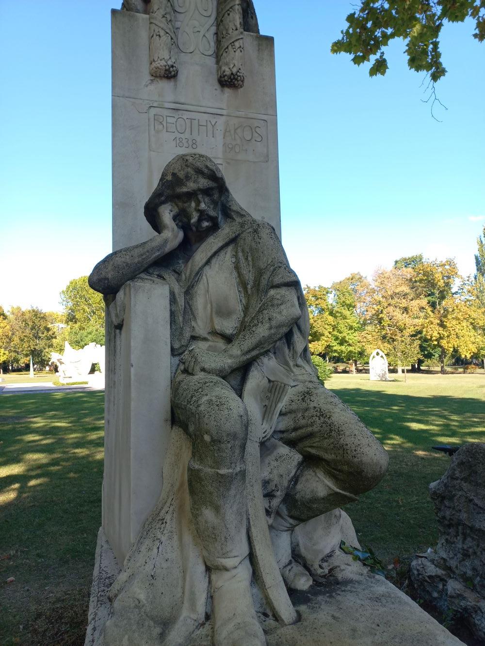 An insurgent kuruc knight sits with sabre in hand, leaning his head on his arm, on the pedestal of the memorial obelisk to the well-known politician and publicist. The entire body language and gaze of the warrior speak of mourning and grief, yet at the same time the pictorial image faithfully expresses the habits and mindset of the deceased. On his death, his contemporaries characterized him as the ‘last kuruc’, for whom warring and the fight were his life and political career.