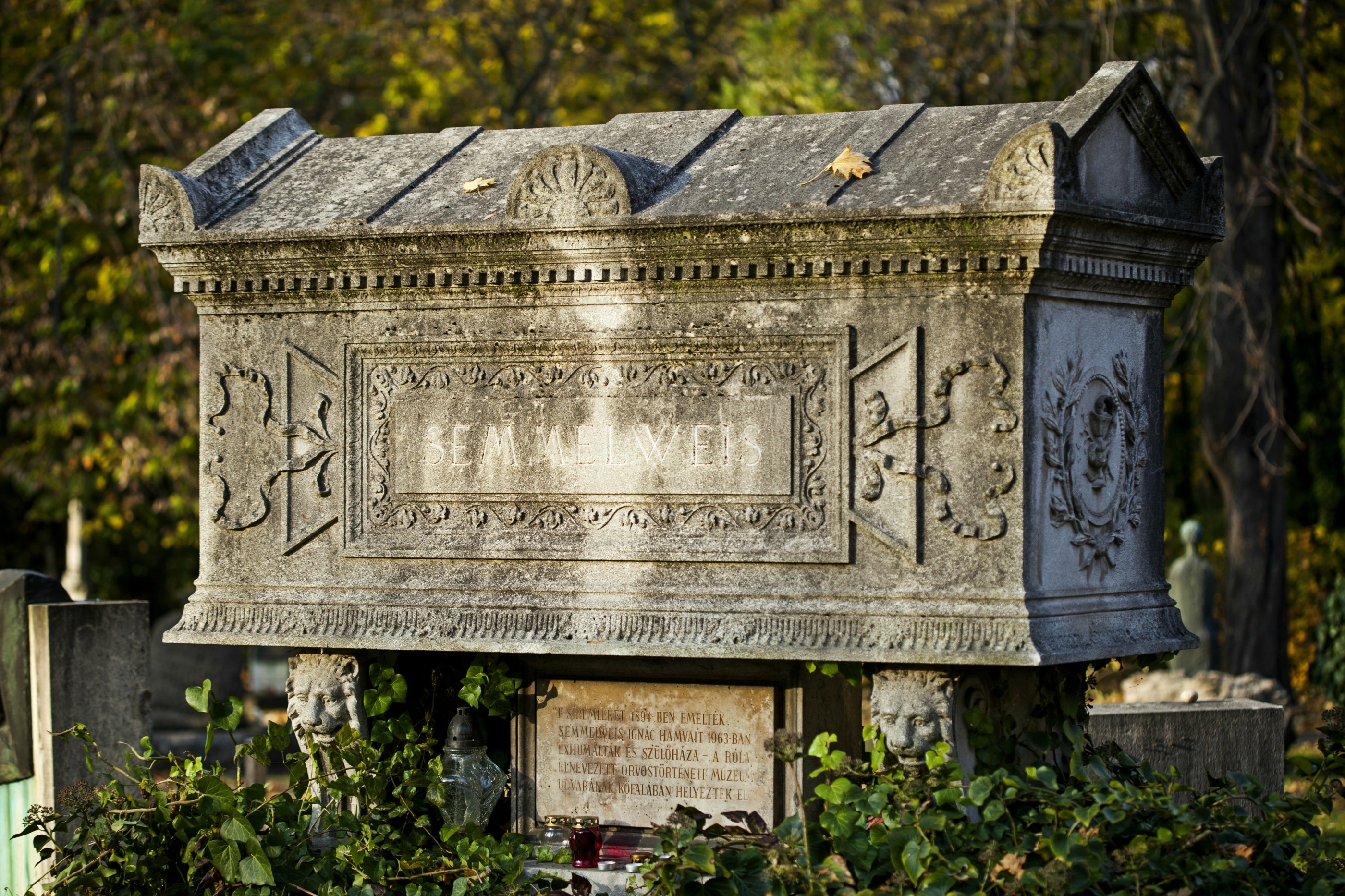 The ornate stone sarcophagus marks the former grave of Ignác Semmelweis, the famous Hungarian doctor known as ‘the saviour of mothers’. This was his fourth burial place. He was first interred in the Schmelz cemetery, then his earthly remains were transferred to the crypt of his wife’s family, the Whaltiers (right-hand wall tombs 109). The second exhumation of the doctor took place on 24 April 1894, when an ornate tomb was designated for him in plot 21 of the cemetery, for which a highly worked sarcophagus made by Albert Schickedanz and Fülöp Herczog was commissioned. From there, he was reburied in the ceremonial plots established in 1929 and the ornate sarcophagus was positioned above his remains.