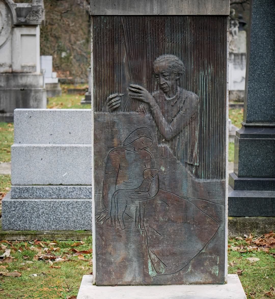 The grave relief of Károly Ferenczy, one of the founders of the Nagybánya school of painting, was crafted by his son, Béni. Originally, the artist intended the relief Young Lovers made in 1918 to go on the grave of his father, but it was impossible to cast it in bronze because he was forced to emigrate. The plaster relief was only cast in bronze many decades later, in 2007, when it was installed on the wall of Pest Vigadó. After the Second World War he once again dusted off the plans for his father’s tomb, but this time he had to give up the project due to a serious illness, cerebral embolism. Having recovered and with his right hand paralysed, he continued working on the tomb relief for his father. The municipality undertook to cover all costs and eventually the memorial was erected on the 100th anniversary of the birth of the painter.