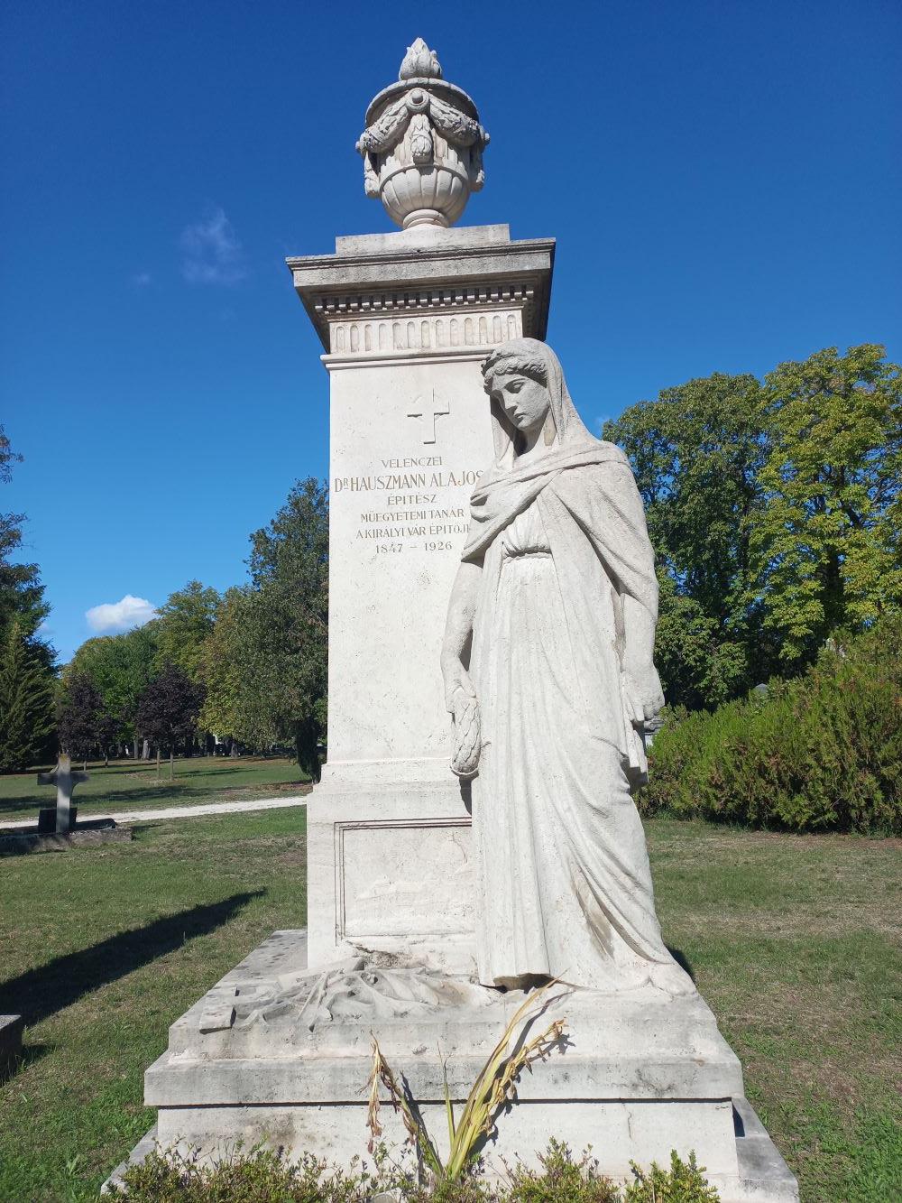 Hauszmann Alajos síremléke egyszerre jeleníti meg a 19. század klasszikus funerális művészet hagyományait és a 20. század első felének emlékállítási jellegzetességeit. Az oszlop és a női alak kompozíciója a 1800-as évek végének síremléktípusát idézi. A köztiszteletben álló ember elvesztésének fájdalmát egy lepelbe burkolt, lehajtott fejű gyászoló női alak testesíti meg, aki jobbjában a halhatatlanságot szimbolizáló babérkoszorút tartja. A női alak mögötti oszlopon egy, a földi lét elmúlását szimbolizáló urna áll a lélek örökkévalóságának lobogó lángjával. Az elhunyt szakmáját, építészi mivoltát a posztamensre elhelyezett munkaeszközei, a vonalzó és a körző jelenítik meg. A talapzatra elhelyezett olajág a végső béke és örök nyugalom meglelésének kifejezője. Az oszlop piedesztálján a Budavári Palota épületegyüttesének domborképe látható. Több e korszakban emelt sírjelen megfigyelhető, hogy az elhunyt legjelentősebbnek tartott alkotásai kerülnek rá a síremlék domborművére, kifejezve az elhunyt érdemeinek méltatását, emlékének tiszteletét. Ilyen dombormű ékesíti többek között Alpár Ignác, Zielinski Szilárd és Bláthy Ottó Titusz síremlékét is. Mint ismeretes, Ybl Miklós halála után Hauszmann Alajost bízták meg a Budavári Palota átépítésének tervezésével és a munkálatok lebonyolításával. Az épületegyüttes a több mint tíz esztendeig tartó építkezés után nyerte el a napjainkban is ismert arculatát. A Budavári Palota sok más jelentős épület sorában egyértelműen az építész főművének tekinthető.