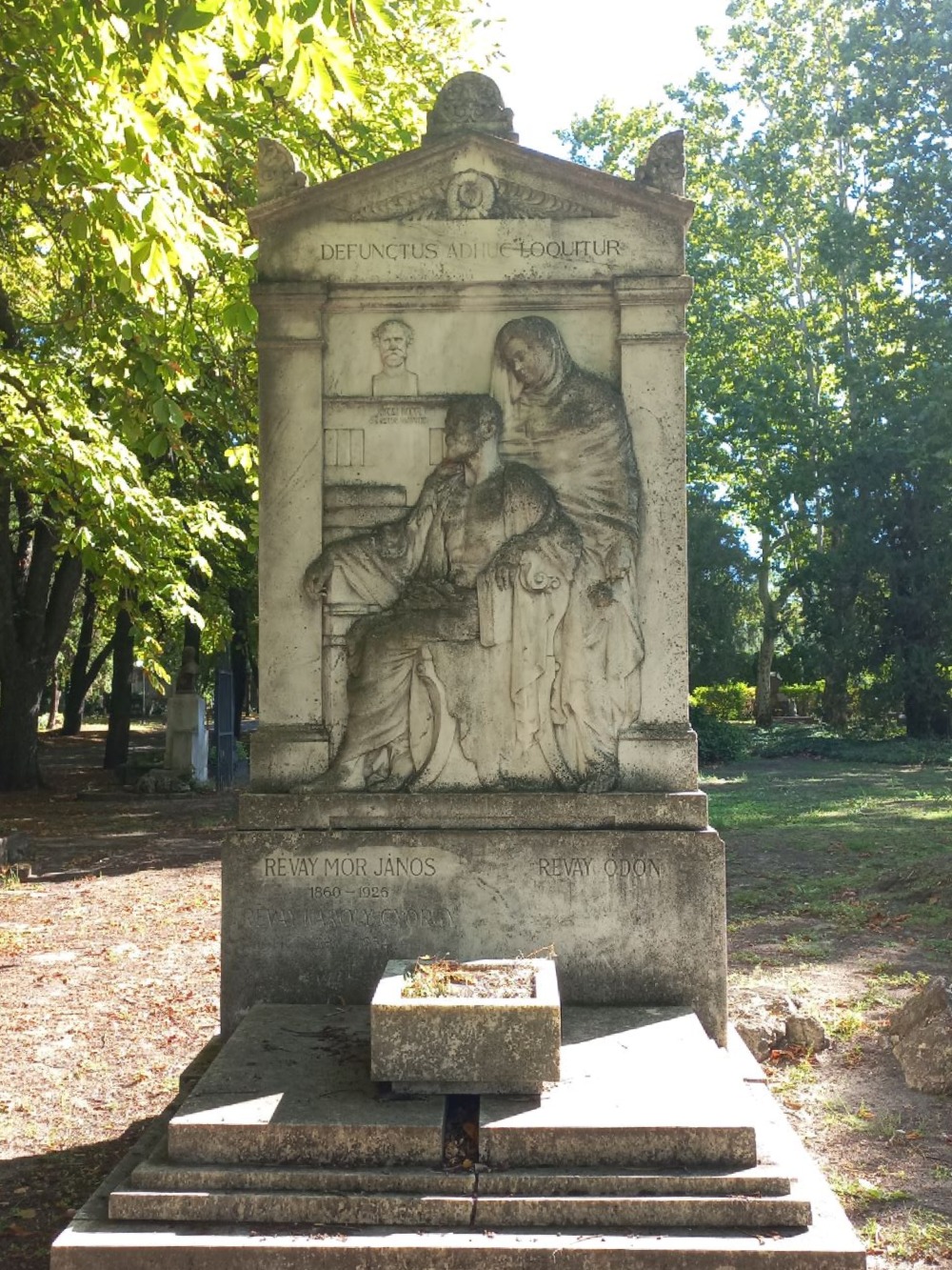 A neves könyvkiadó antikizáló hatású síremléke azok közé a sírtípusok közé tartozik, amelyek az elhunyt munkásságát idézik meg. A dombormű egy nevezetes athéni sztélét idéz meg, Xanthippos sírját, amelyen az elhunyt ülő alakja látható. A Révay Mórt megidéző lepelbe burkolt férfi egy klismos-on, azaz egy ókori görög széken ül. Jobb kezét oszlopon nyugtatja, bal kezét egy könyvön, mutatóujját a lapok közé helyezve, mint aki épp olvasmányát félbe szakítva, elgondolkozva tekintetét a távolba, immár a túlvilági lét felé emeli. Mögötte felesége támogatóan áll, jobb kezét férjének vállára helyezi, bal kezében pedig az emlékezés virágát, egy rózsaszálat tart. A háttérben könyvek sorakoznak, a Révai kiadó legnagyszerűbb kiadványai, a Révai lexikon sorozata és Jókai Mór összes műve. A pulpituson Jókai Mór büsztje helyezkedik el.